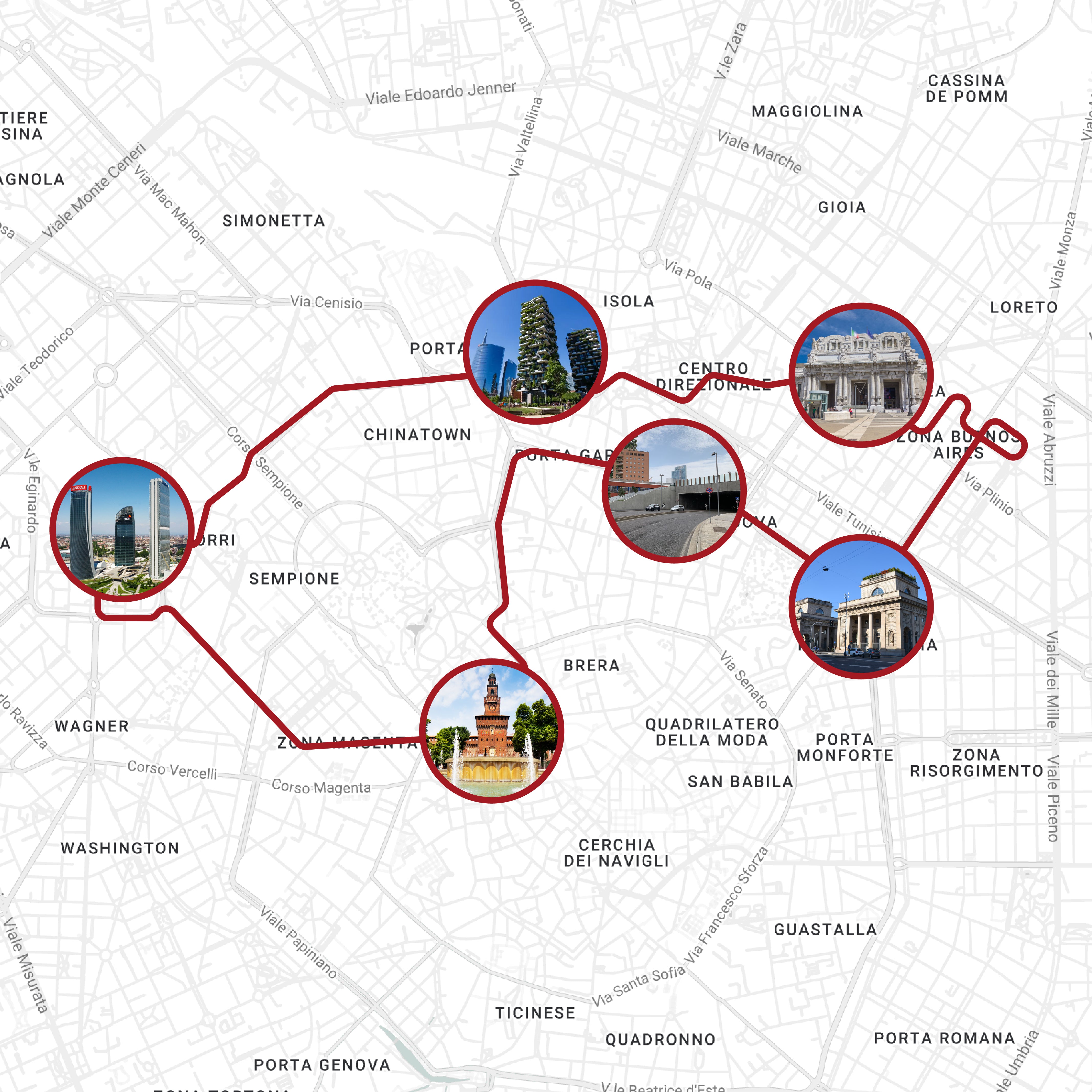 Parti da Porta Nuova, attraversa il cuore pulsante della città toccando luoghi iconici come il Bosco Verticale, la futuristica zona di CityLife, lo storico Castello Sforzesco, la scenografica Stazione Centrale e l’energia travolgente di Corso Buenos Aires.